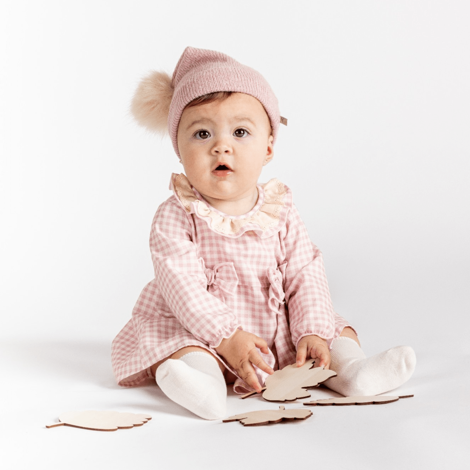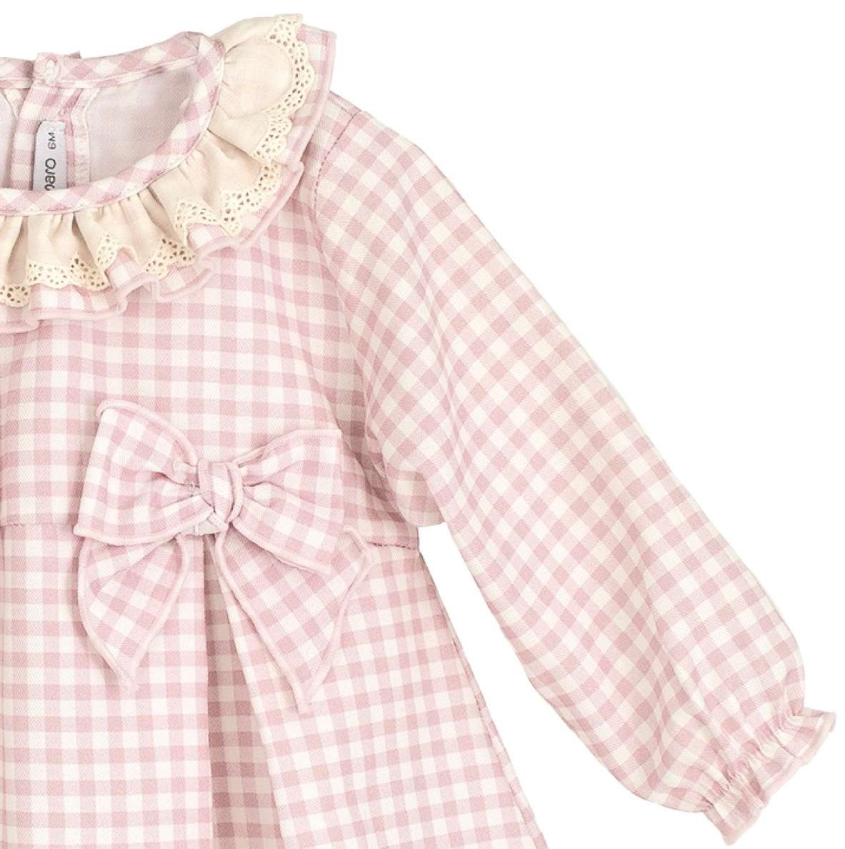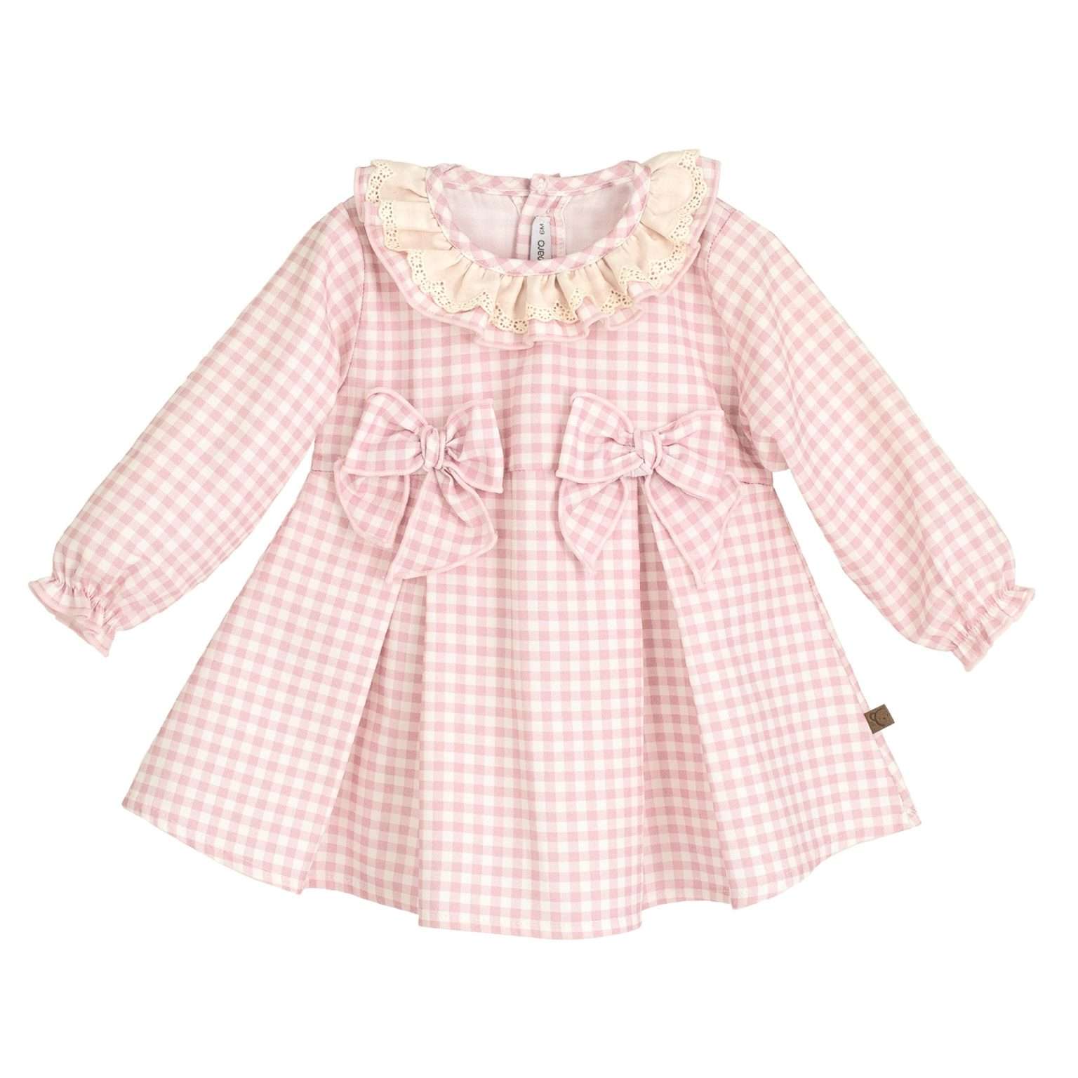 Abitino fantasia a quadretti.Collo volant con inserto in pizzo, fiocchetti in vita.