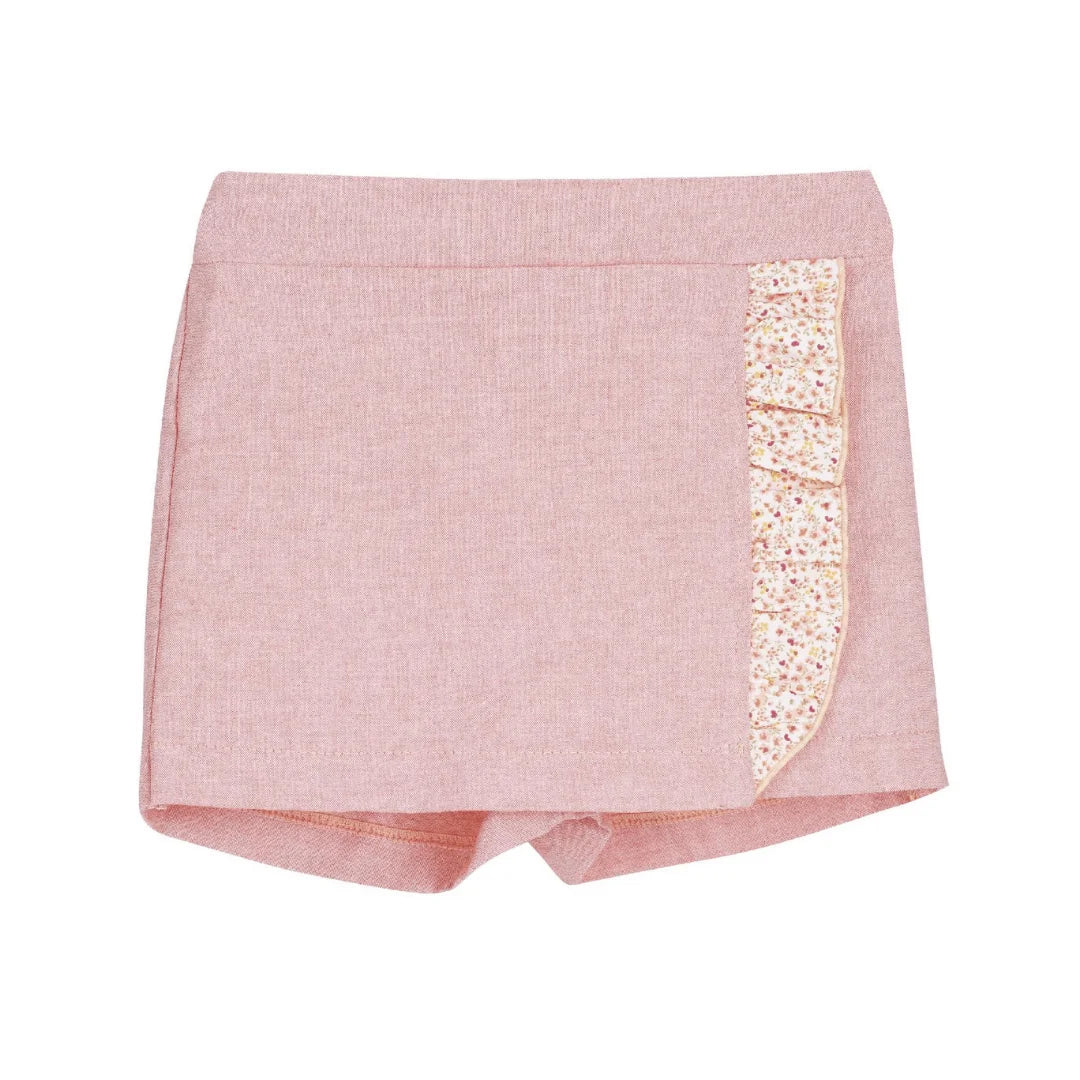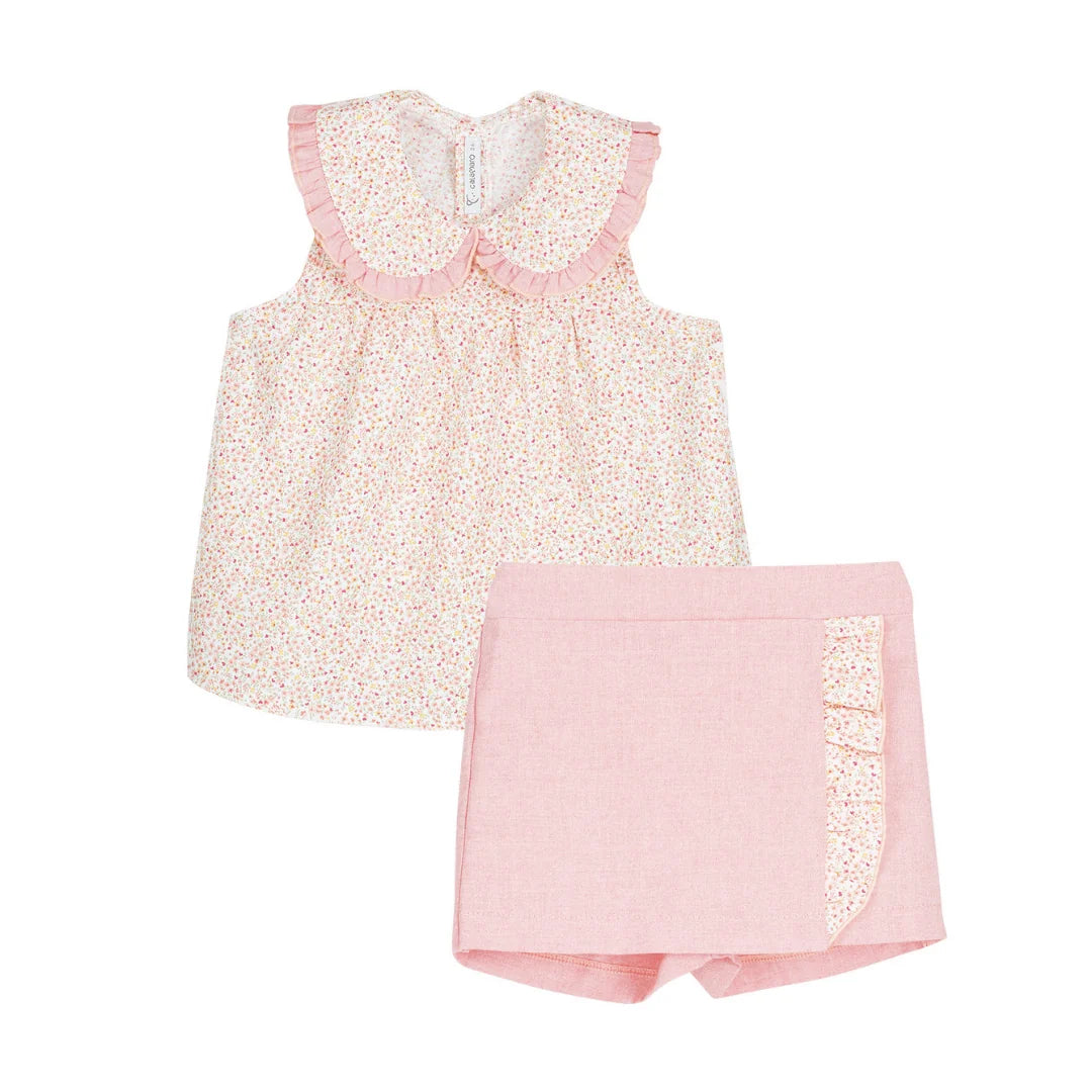 Completo da bambina con top e pantaloncino. Parte superiore con stampa floreale, ampio colletto peter pan con piccolo volant arricciato. Parte inferiore realizzata in tessuto testurizzato con dettaglio distintivo sul lsto che riprende la stampa del top.
