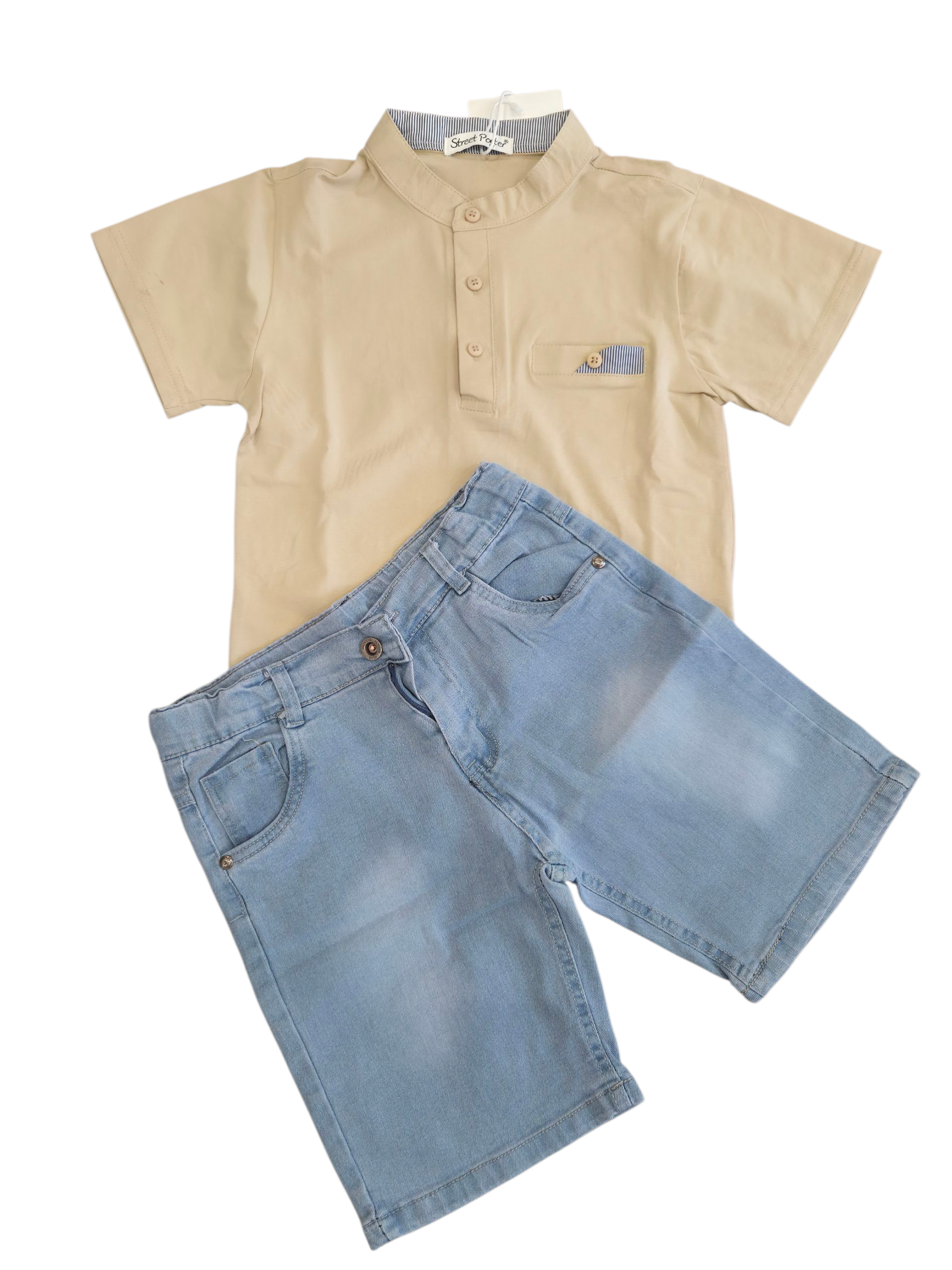 Completino bambino composto da jeans e t-shirt. Realizzato con materiali di alta qualità e massimo comfort per il tuo bambino. Perfetto per l'uso quotidiano, i jeans sono resistenti e la t-shirt è morbida sulla pelle. Dai al tuo bambino il meglio della moda con questo completino.